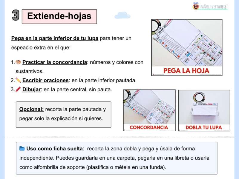 Anima a tus peques a personalizar ´las natura-lupas´ para que buscar vocabulario en la naturaleza. Encontrarás la cara B con tablas para oraciones, conjugar o personalizar.