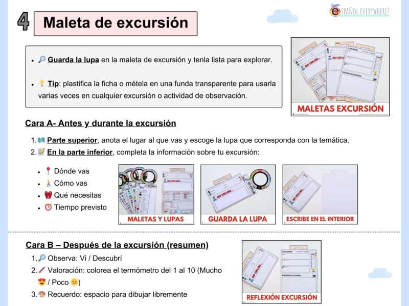 Complementa las lupas con las presentaciones PPT, los maletines para colores y ´las natura-maletas,´ que te servirán como ficha de excursión y también para reforzar vocabulario y gramática: Plurales, género, concordancia, conjugación, oraciones en presente de indicativo o cualquier tiempo.