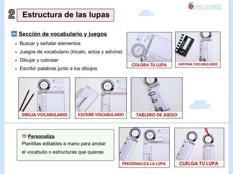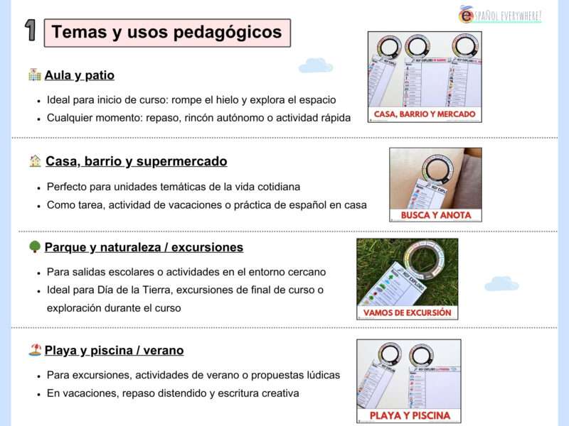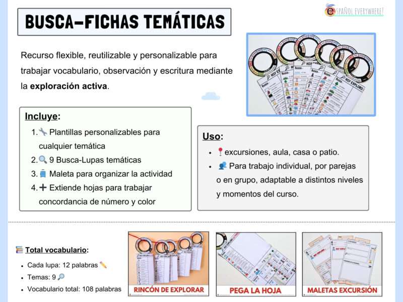 Con el pack Busca-Lupas podéis trabajar 9 temas y hasta 108 palabras de vocabulario, con versiones con o sin pauta. Hay de todo: Aula, Casa, Barrio, Supermercado, Parque, Naturaleza, Excursiones, Playa o Piscina. Y lo mejor: todo es reutilizable, se puede plastificar o usar como mini pizarra con rotuladores borrables.