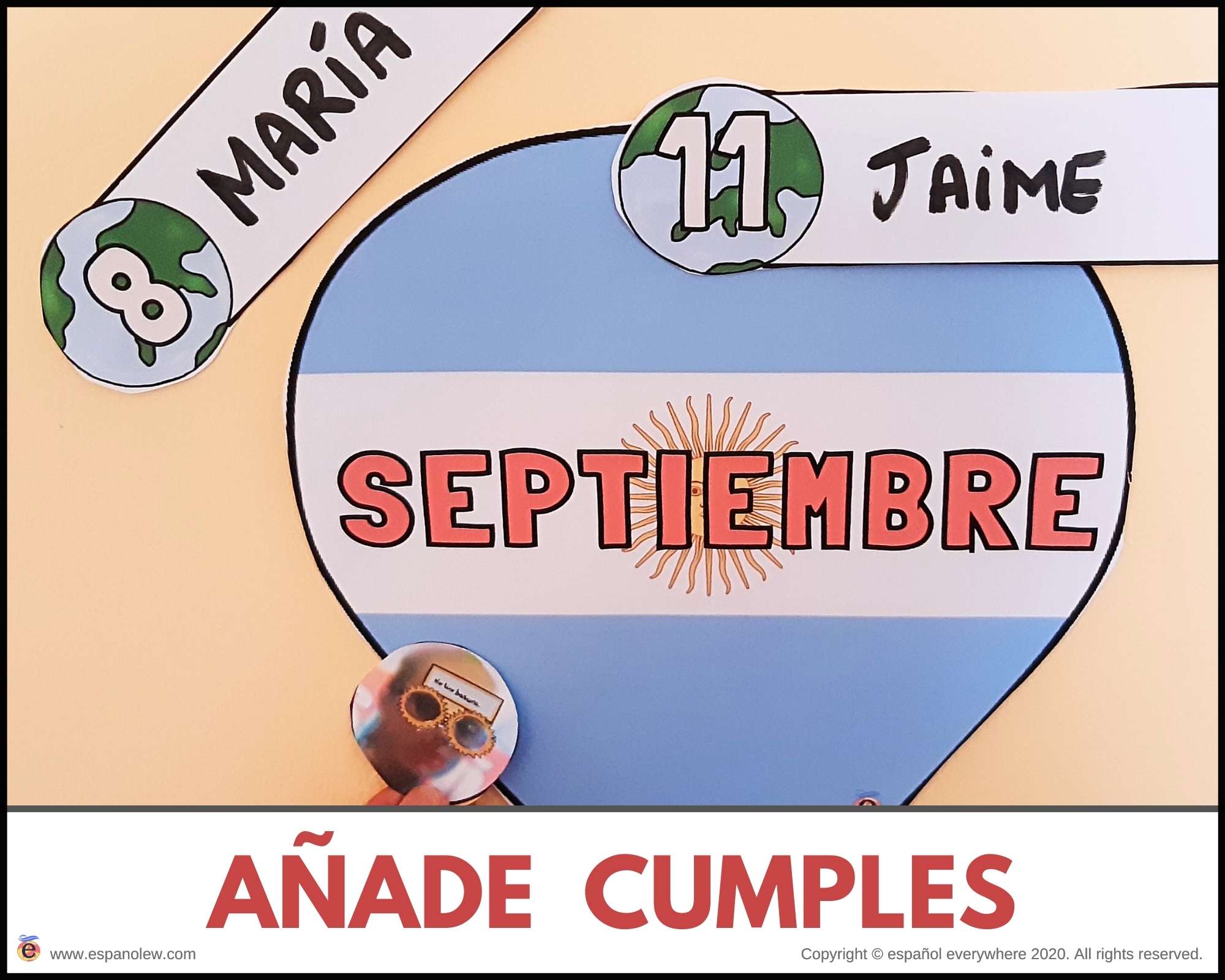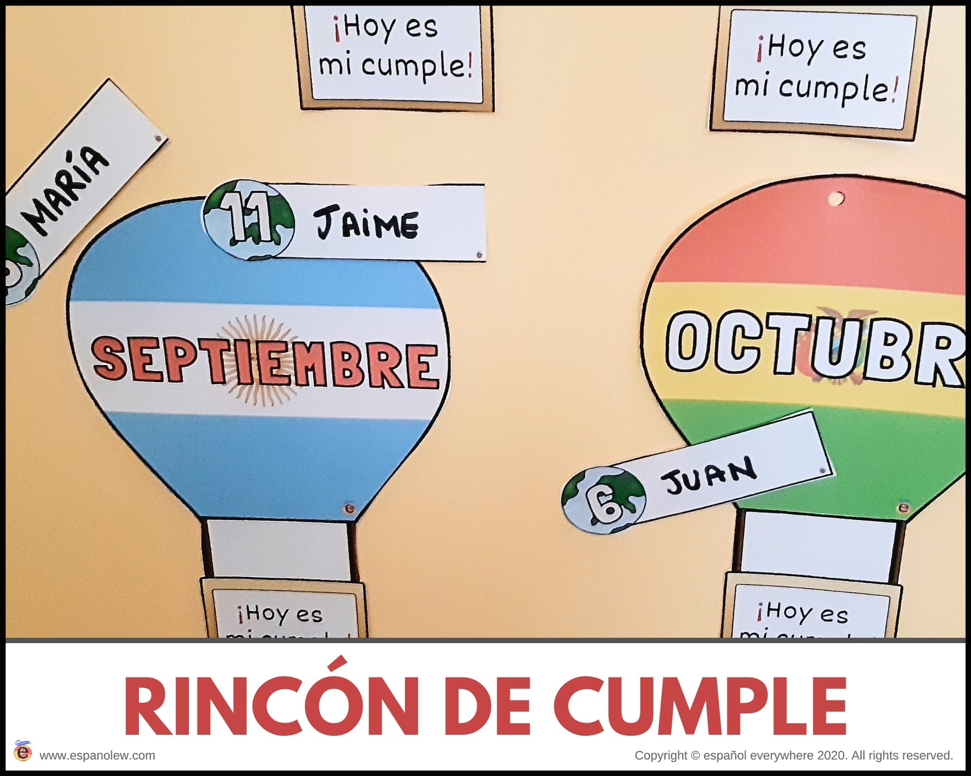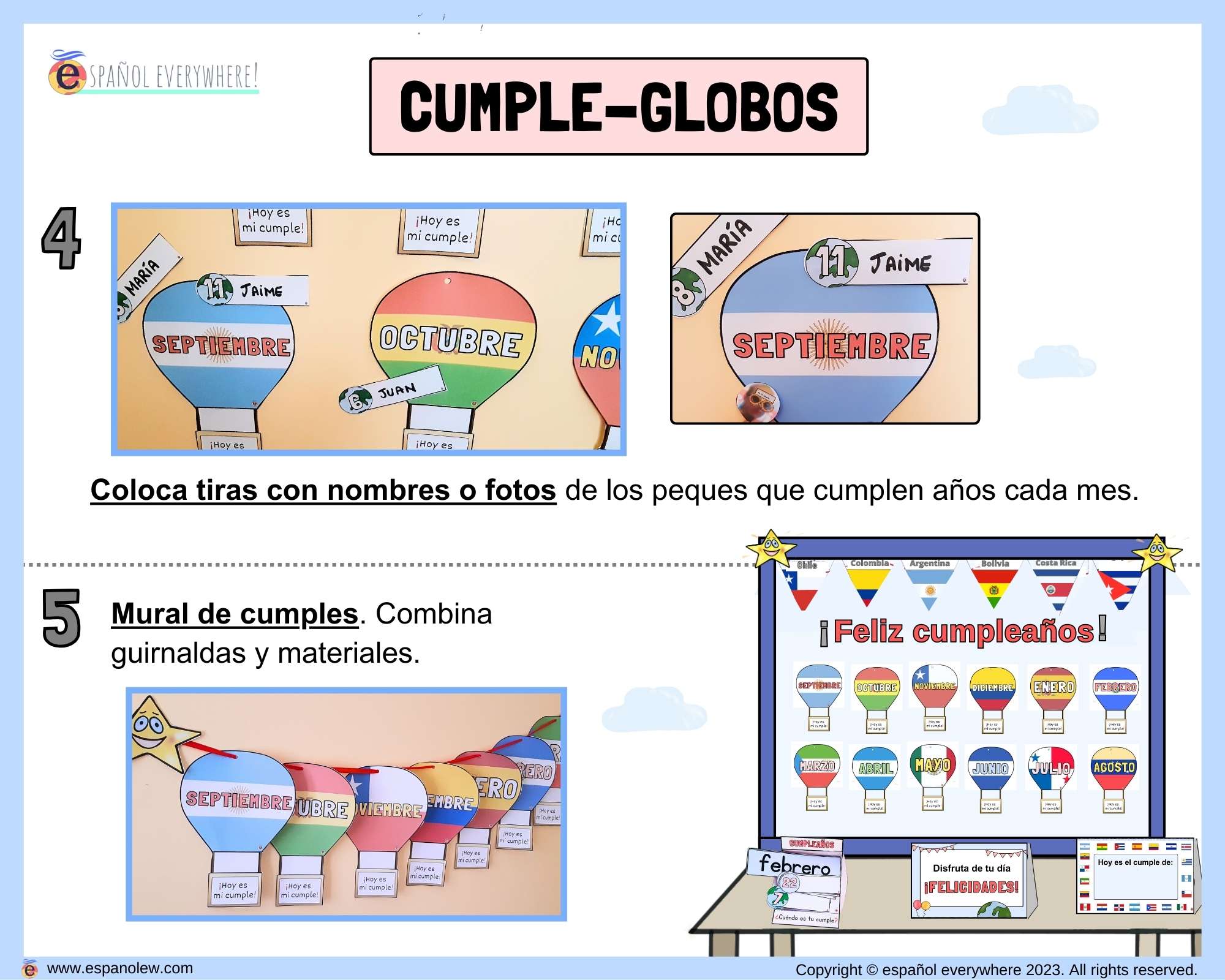 Destina un espacio para colocar cualquiera de los 96 carteles y etiquetas para el nombre así como las cajitas para que los peques anoten cuando es su cumpleaños. Si haces un mural con todos los meses, puedes colocarles los carteles ´los cumples´ o ´los cumpleaños´ (fondo de países hispanohablantes) en formato Word modificable para que cambies el tamaño, letra y color.