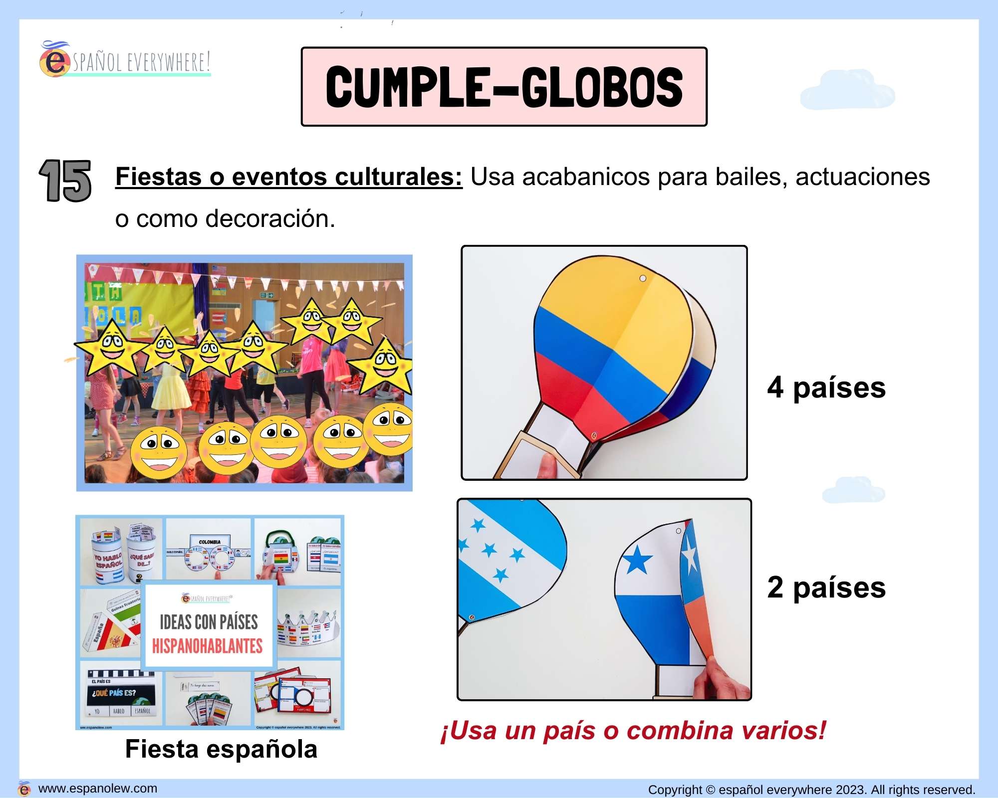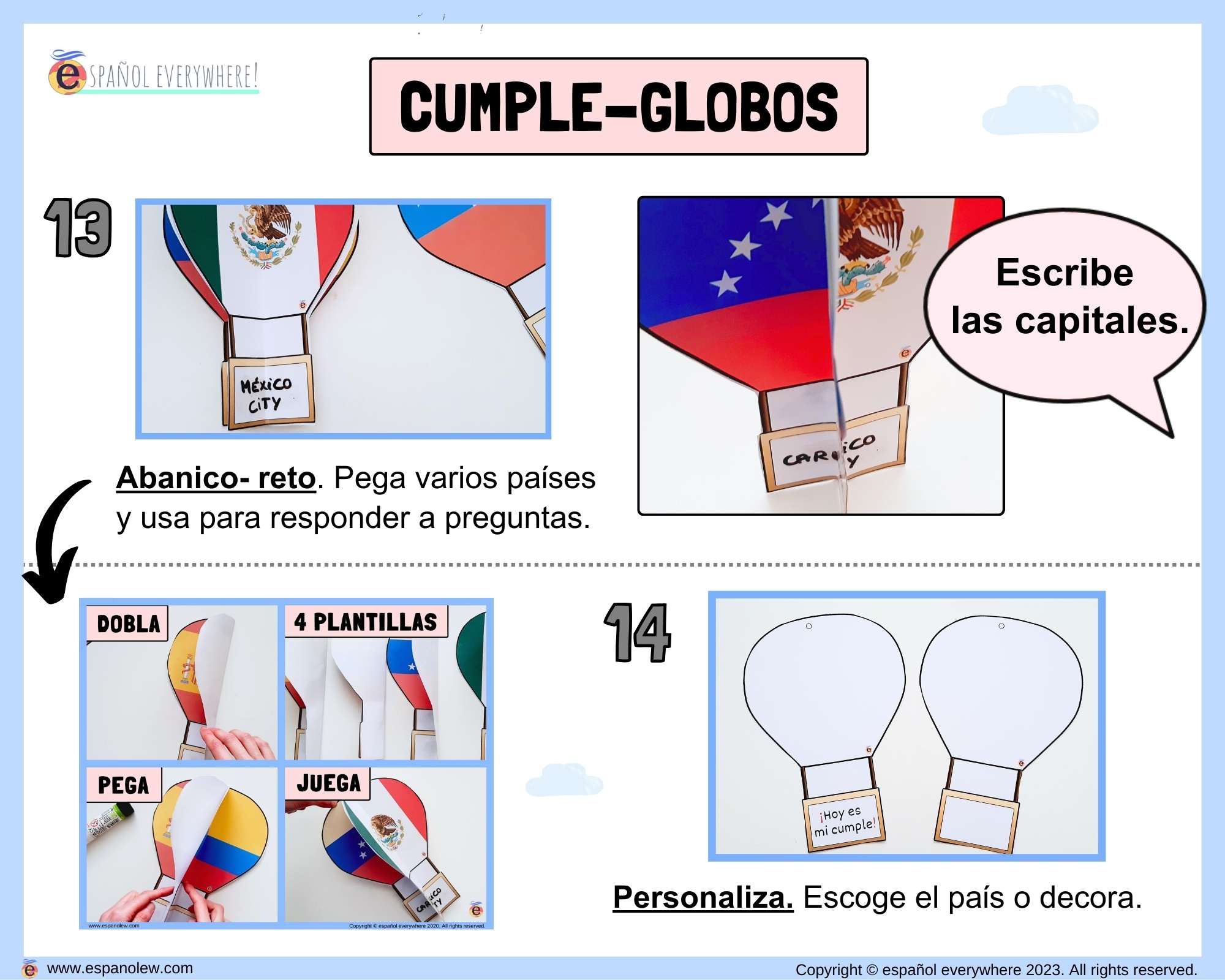 Combina los materiales de cumple con ´los cumple-globos´que incluyen 12 países de habla hispana y la opción de globo para que pegues fotos de los peques o coloques las tiras para números y nombres. Tamnbién puedes usarlos para jeugos de países, abanicos de feistas y mucho más.
