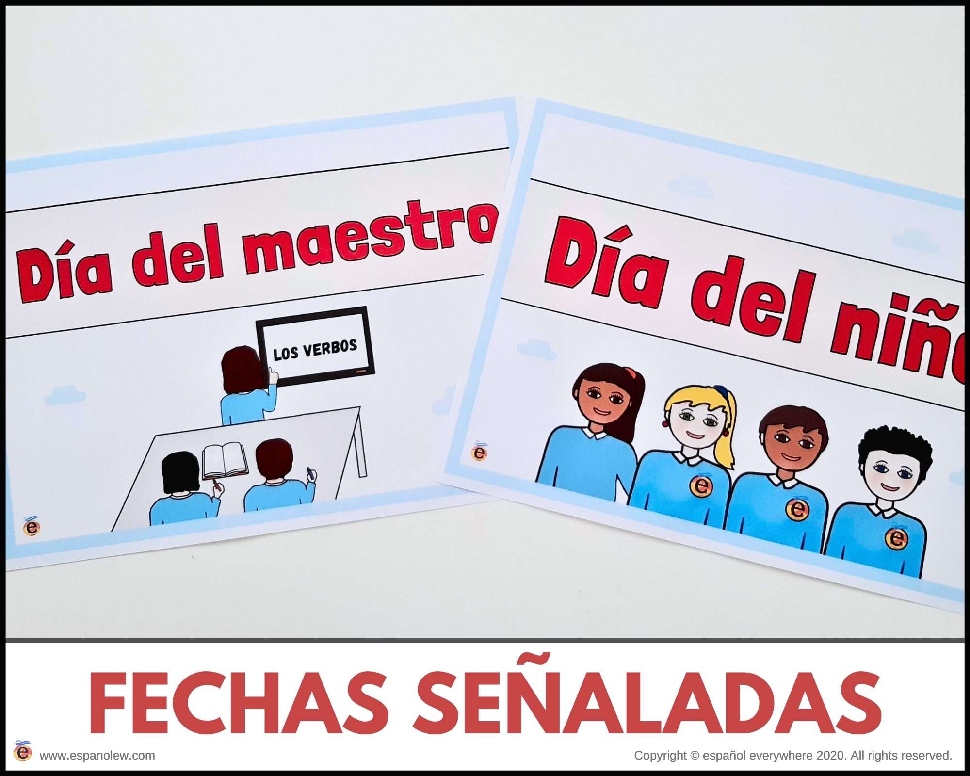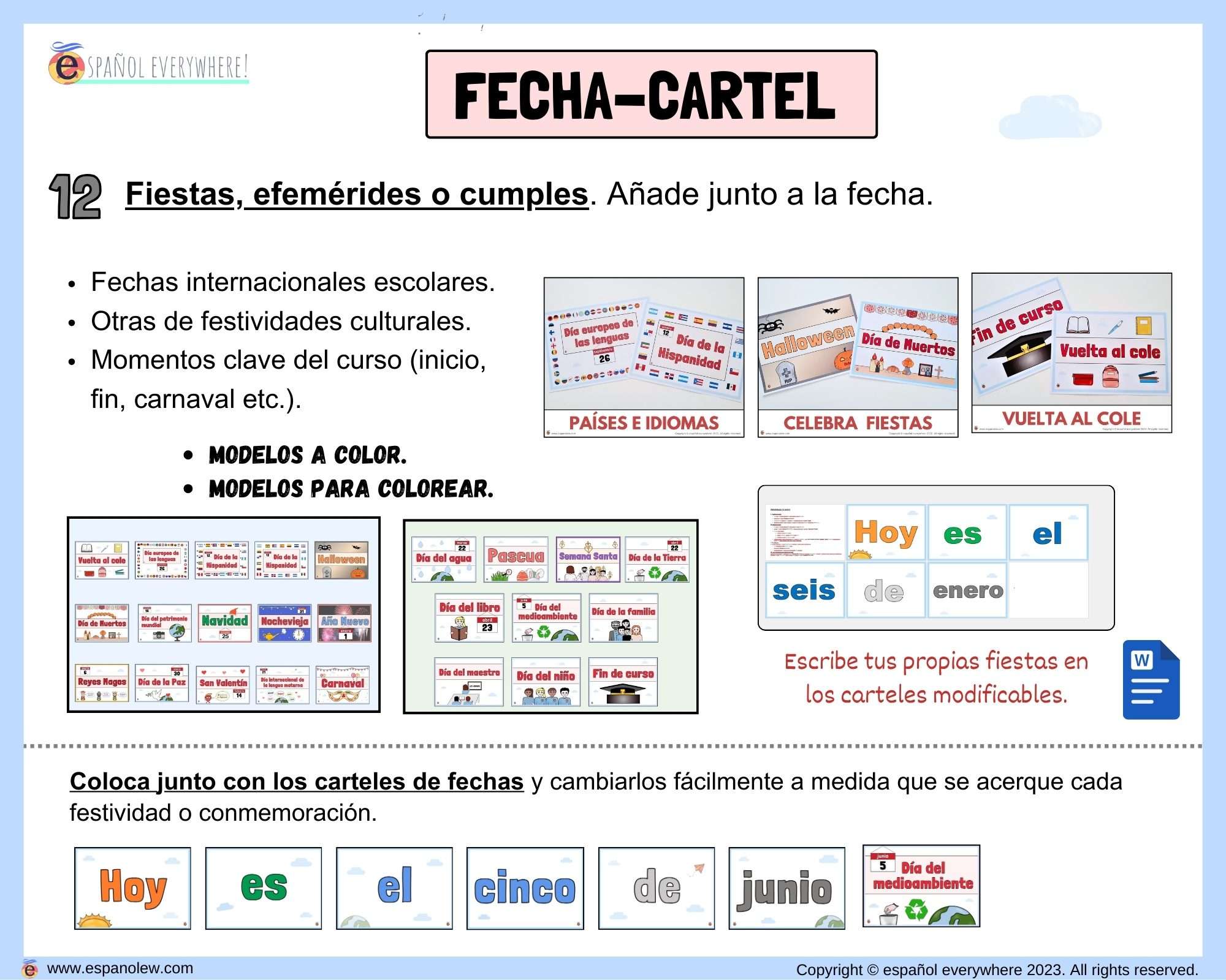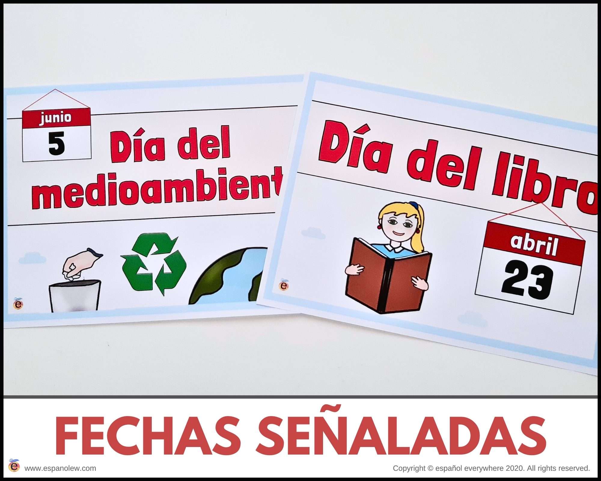 Además, incluye carteles con fechas señaladas, que puedes añadir a la fecha del día y cambiar diariamente o cuando sea la festividad, haciendo que el rincón de fechas sea dinámico y divertido.