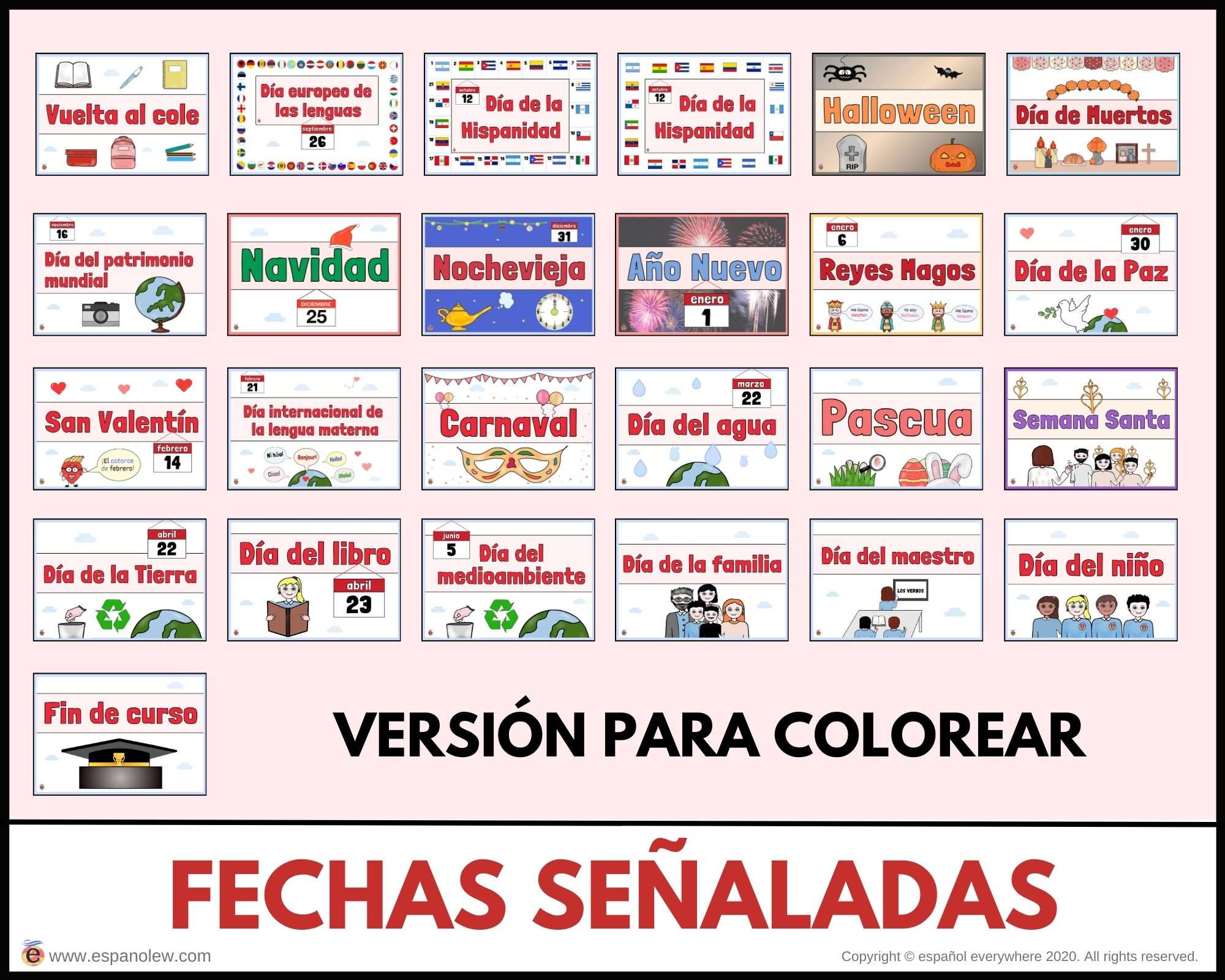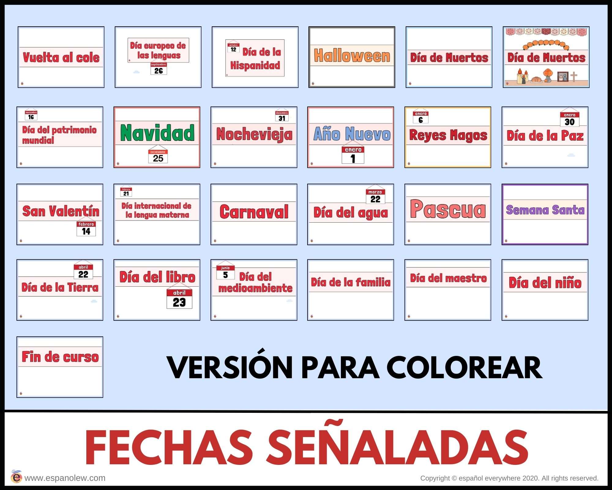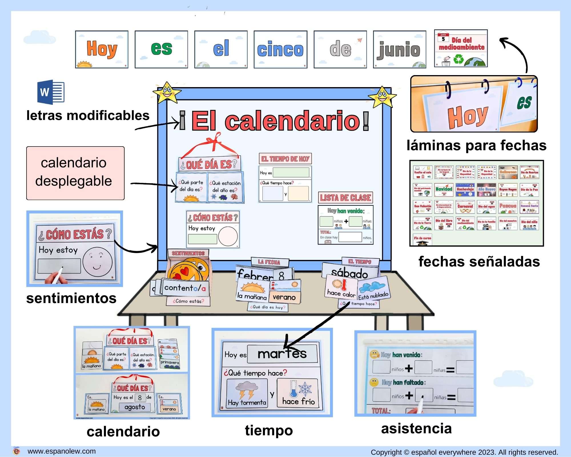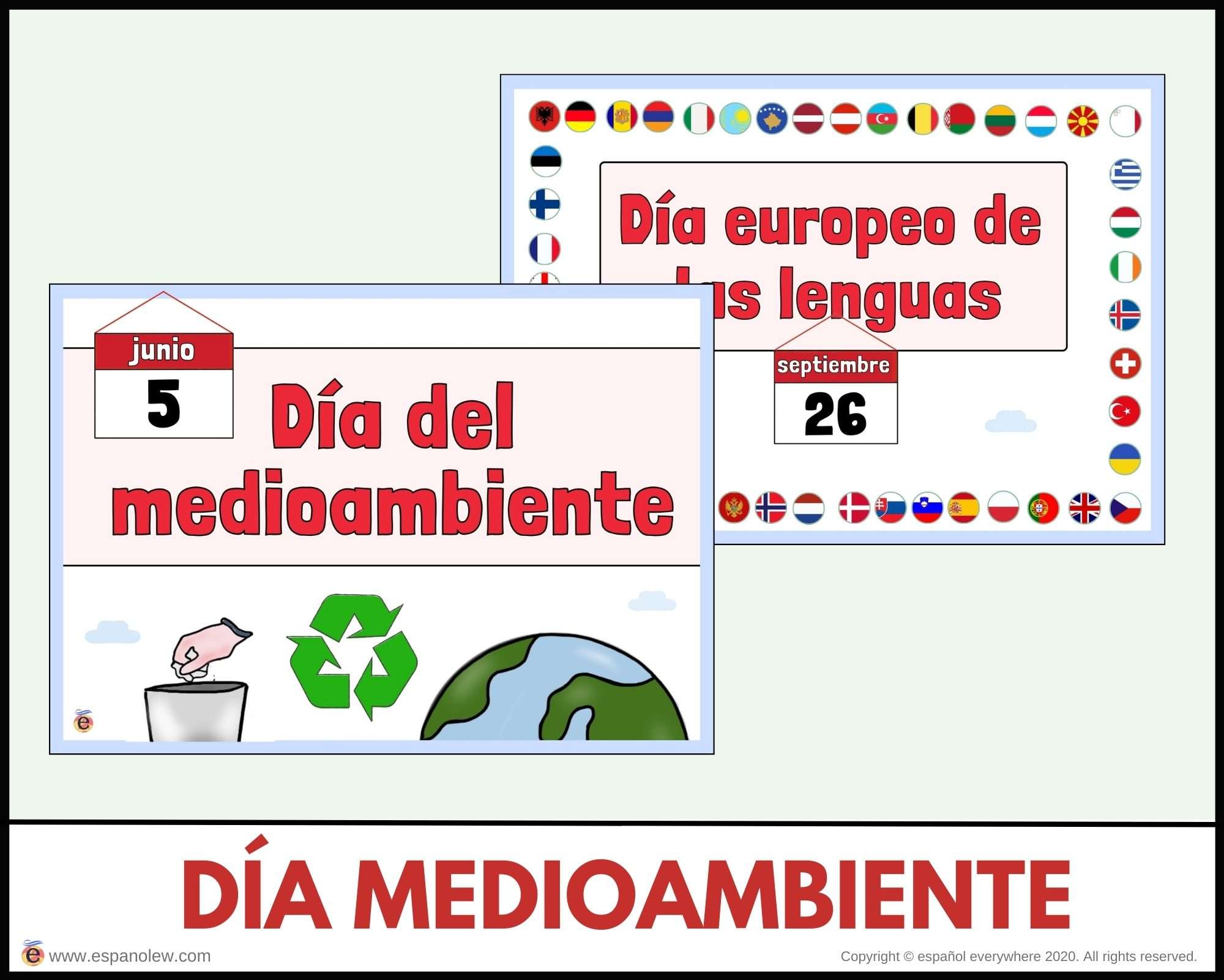 Además, incluye carteles con fechas señaladas, que puedes añadir a la fecha del día y cambiar diariamente o cuando sea la festividad, haciendo que el rincón de fechas sea dinámico y divertido.