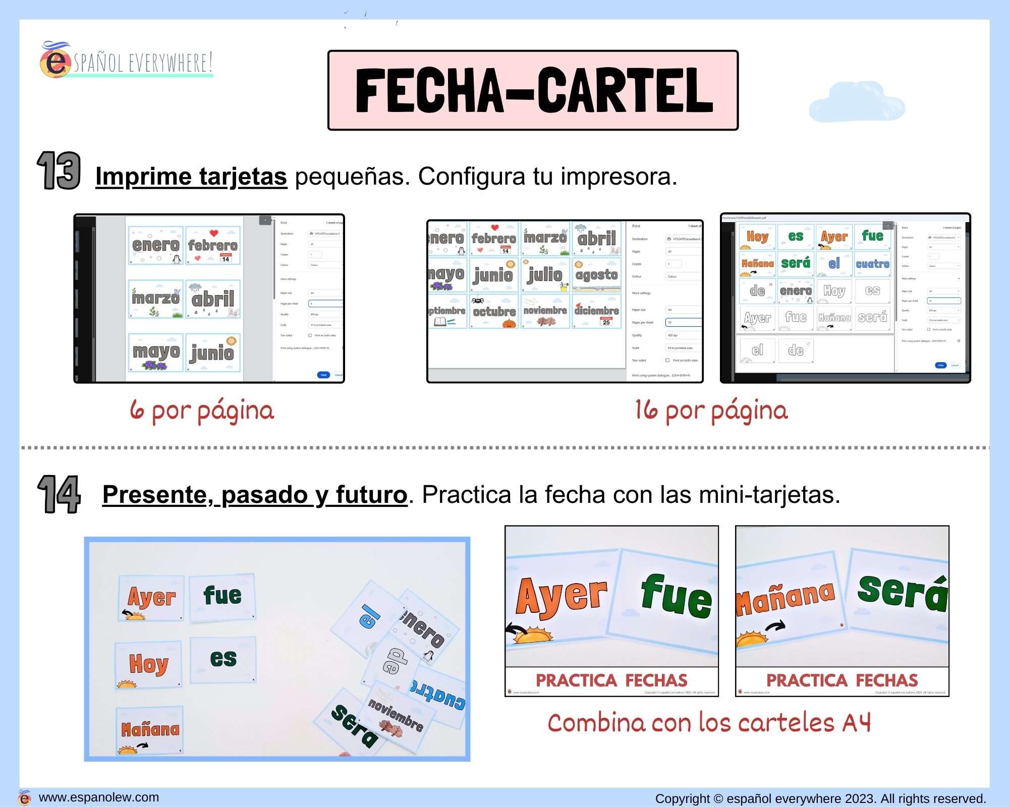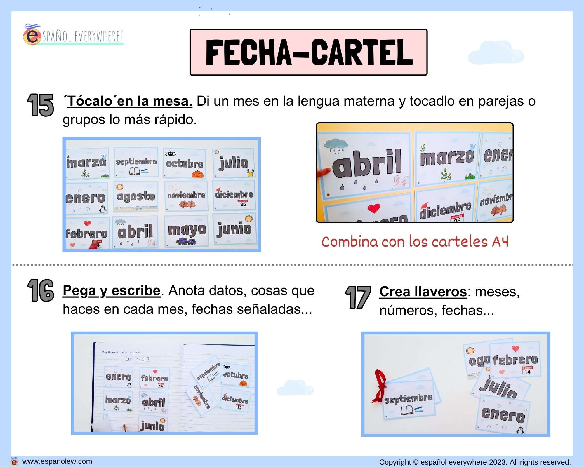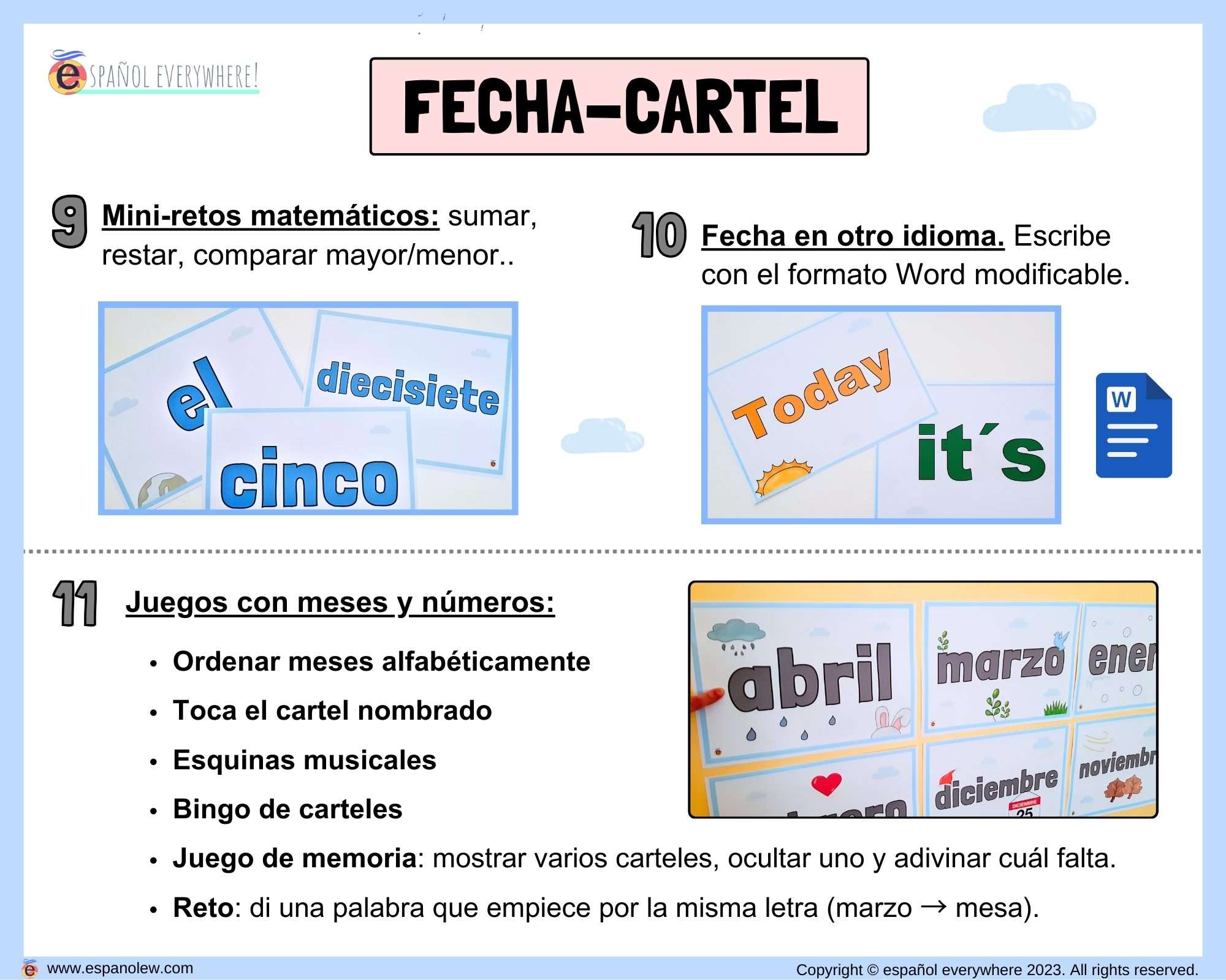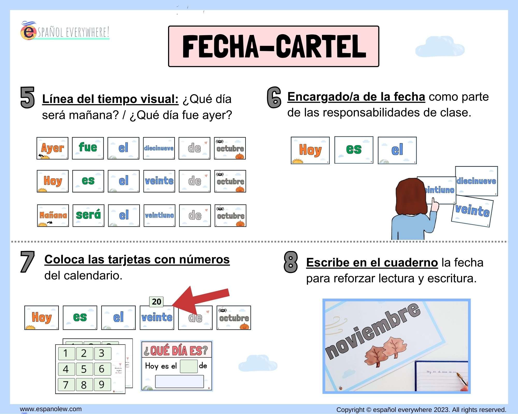 Este pack también permitirá a tus estudiantes practicar la fecha con carteles que puedes colocar en un lugar visible para tener siempre a mano, o imprimir a escala más pequeña para usar en juegos o pegar en la libreta.