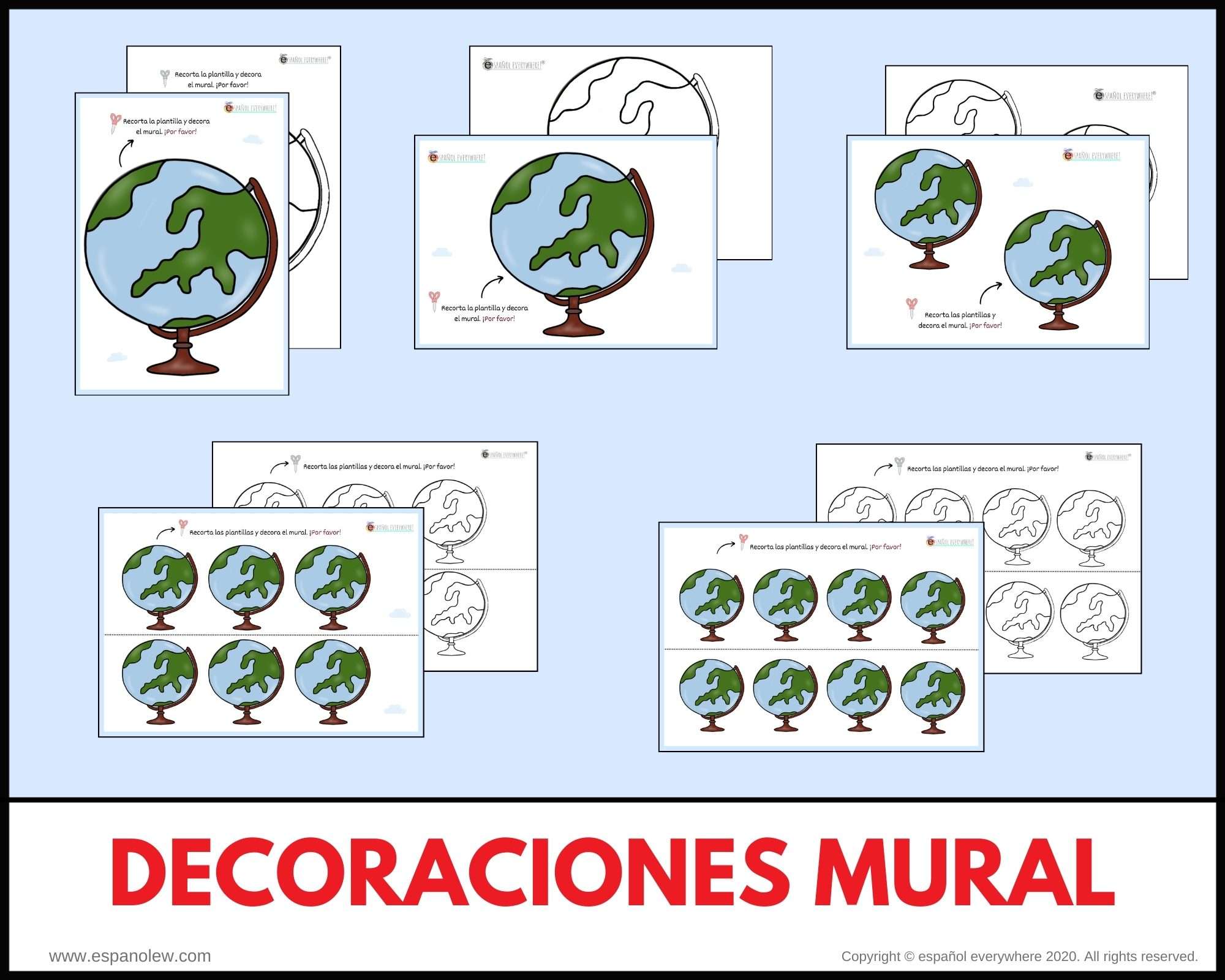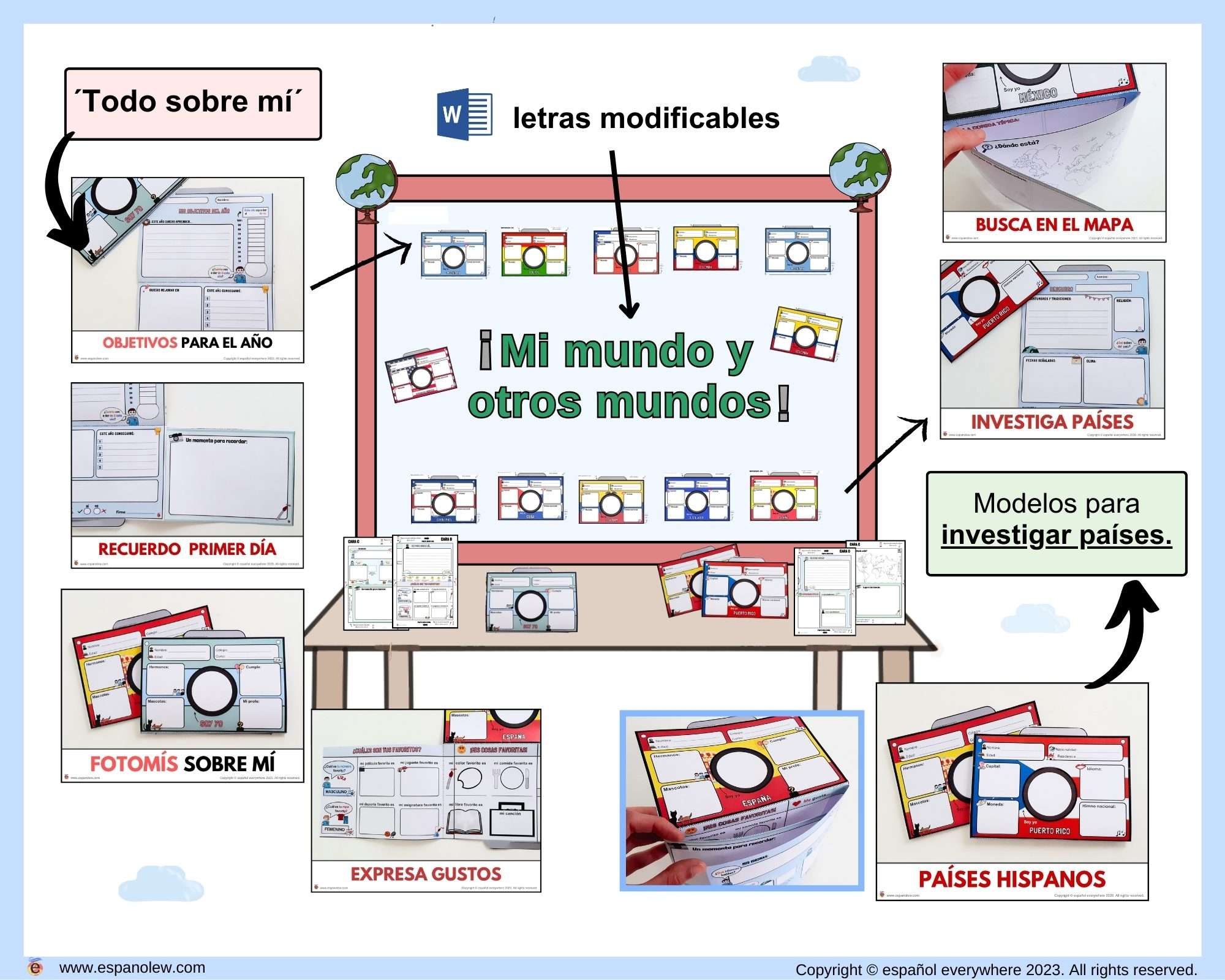 Cada modelo incluye las variantes ´sobre mí´, con la ficha técnica sobre el país y personalizable. Además de la opción vista en el apartado anterior, tus peques podrán anotar datos (capital, moneda, personajes famosos, clima…), hacer un listado de expresiones útiles, localizar en el mapa, pegar una foto con lugares destacados o hacer una redacción. Incluso preparar un rincón junto con las letras modificables y las decoraciones del mundo.