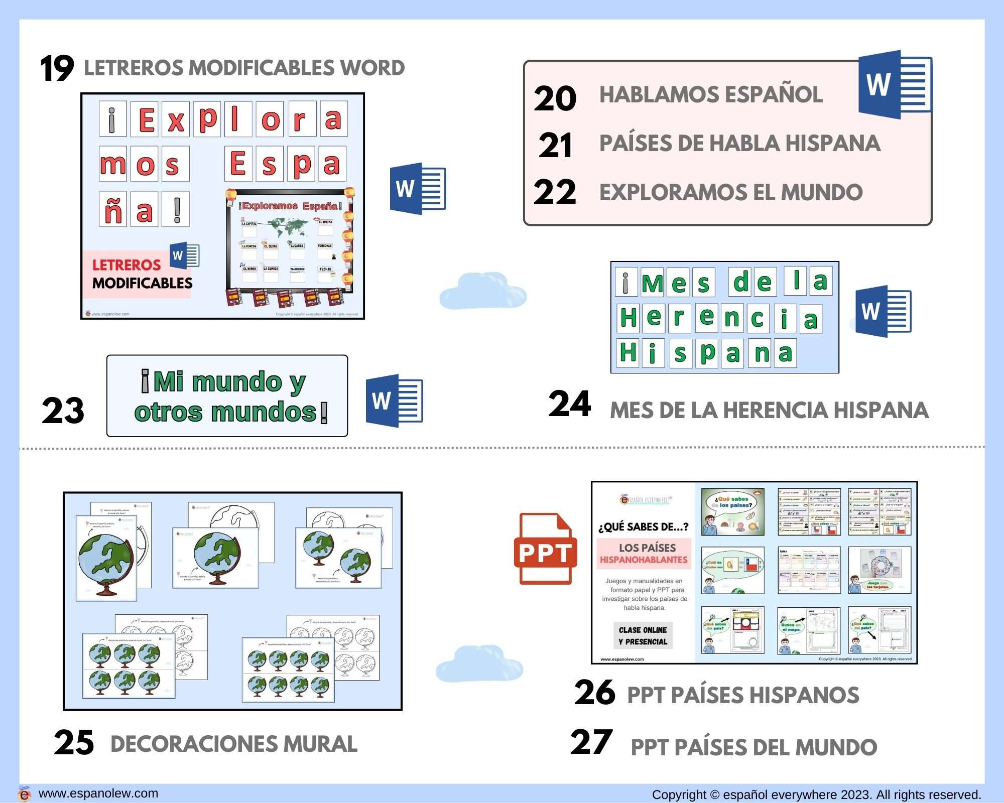 Tienes disponibles 4 modelos disponibles con un total de 1550 páginas: Por un lado la opción para presentarse ´sobre mí´ y por otra parte, 3 modelos con países (21 países hispanohablantes, países que hablan español pero no es el idioma oficial y la opción para dibujar la bandera).