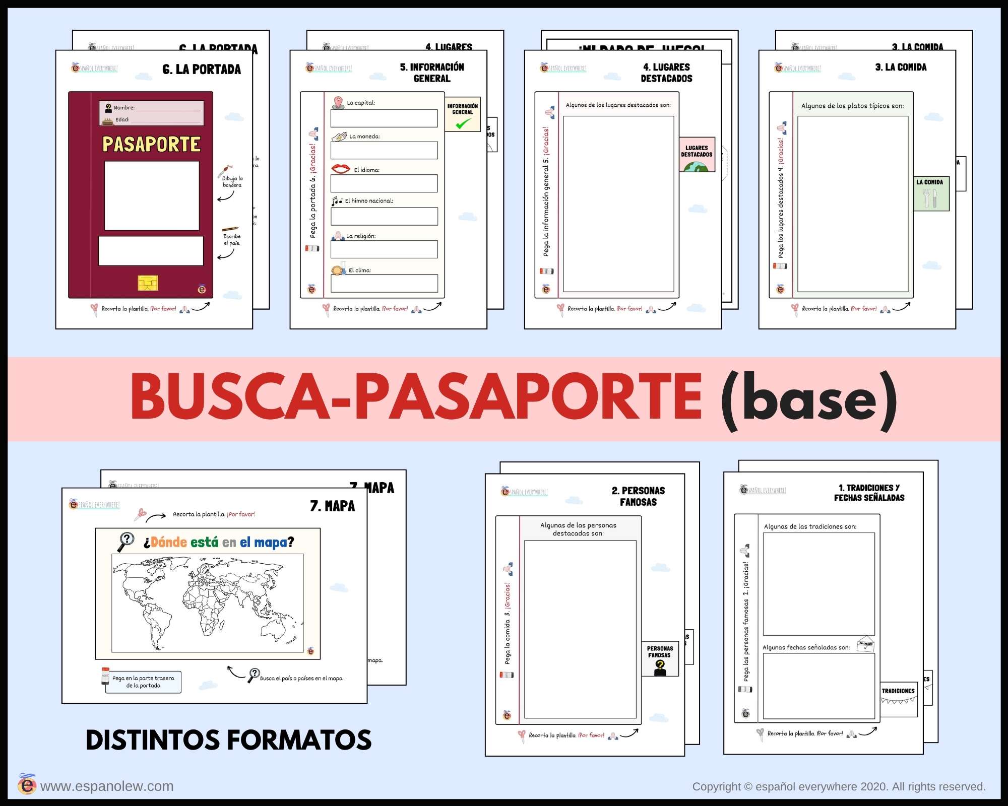 A continuación te dejo algunas ideas para usar los pasaportes combinándolos con otros materiales del pack ‘Busca-pasaportes’, que incluye más plantillas para portadas y bases; sin embargo, puedes adaptarlo al pasaporte básico (incluido en este pack) para juegos de adivinar, crear guirnaldas , dialogar o escribir retos entre otras.