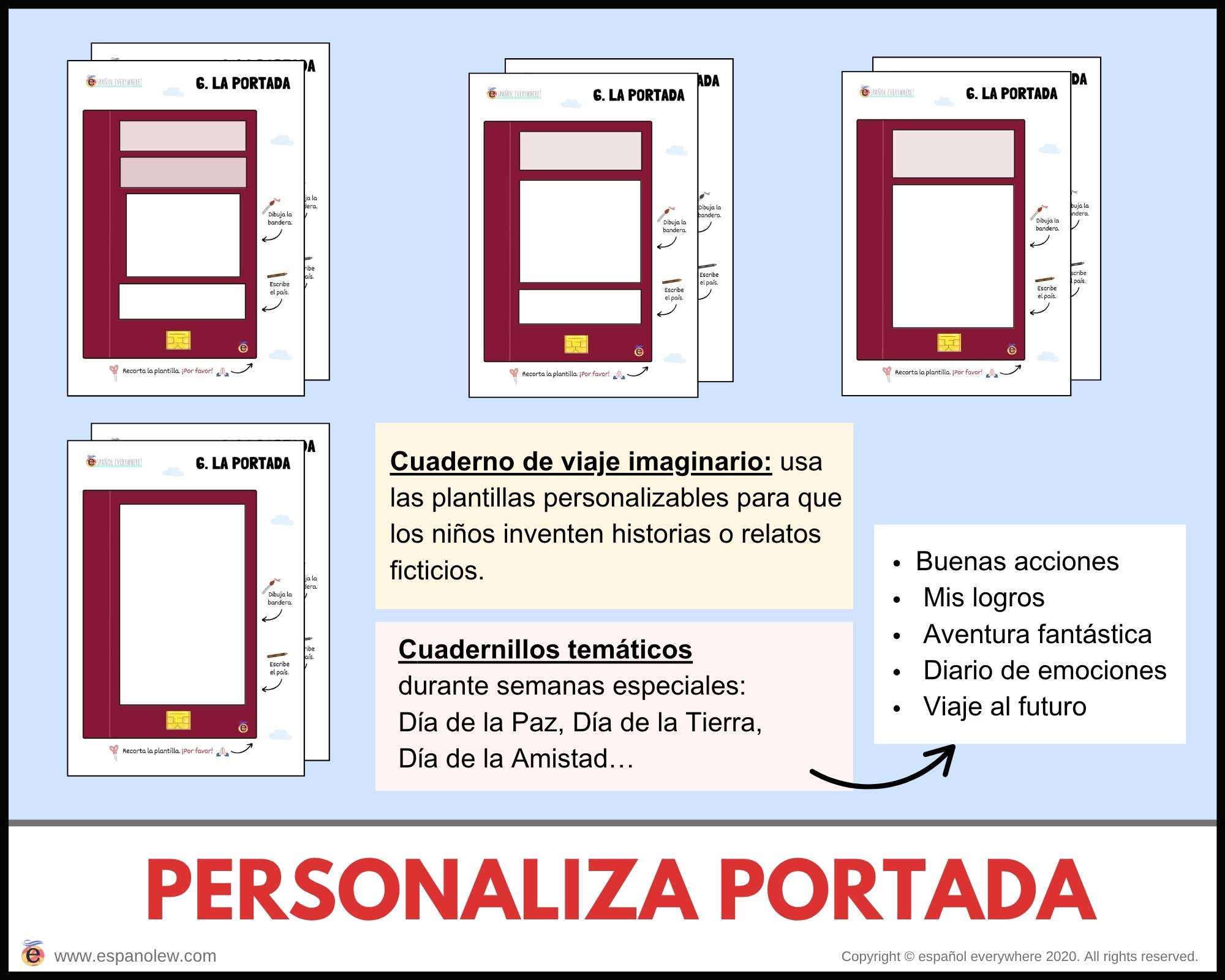 Prepara tu librito de viaje y ten a mano para dialogar en el aeropuerto, hotel, calle, estación o restaurante. Encontrarás dos caras que podrás combinar por dos lados: Versión completa, para traducir, para dibujar, personalizable…Además puedes combinar con los modelos para investigar países y culturas.