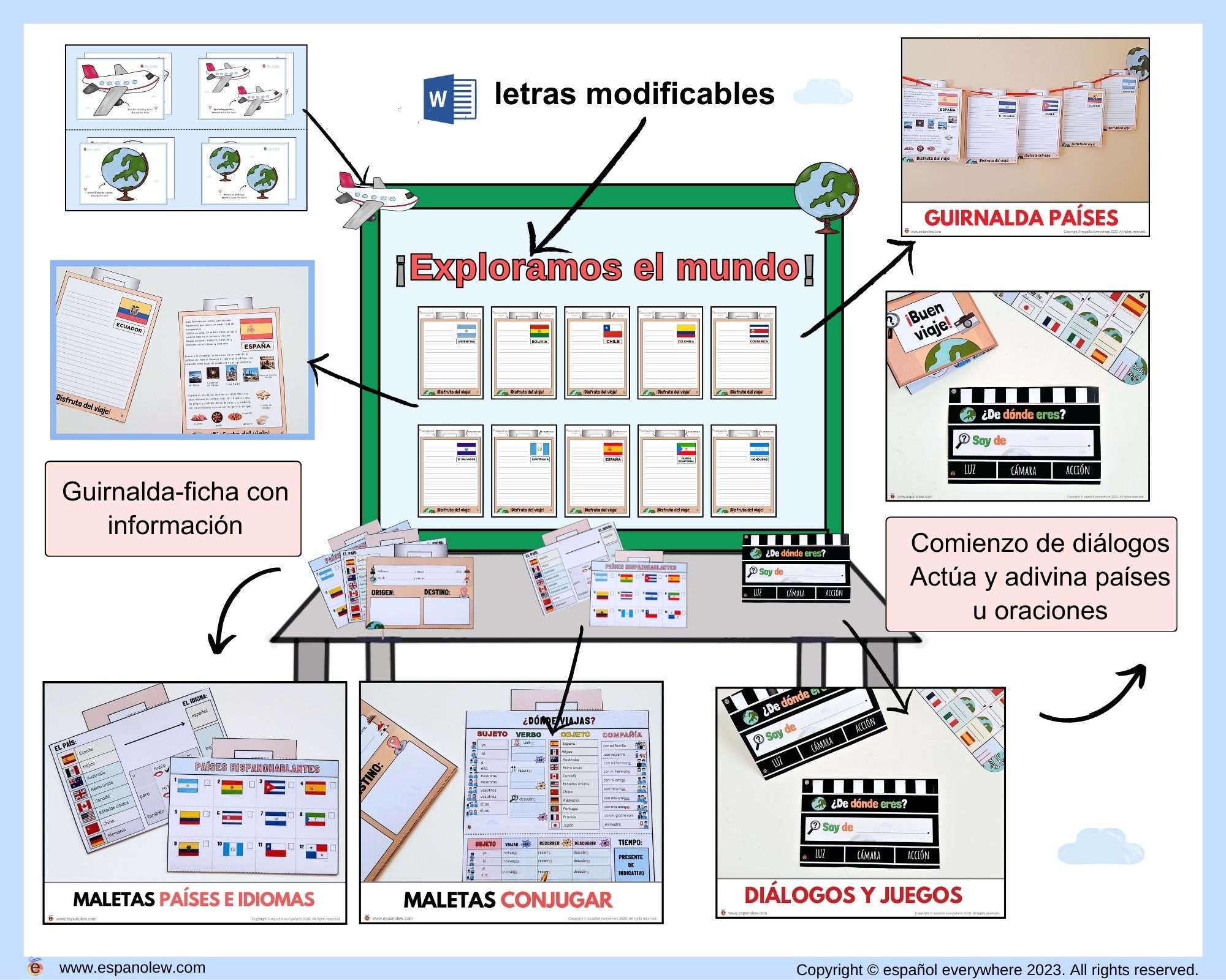 Encontrarás tarjetas de embarque, carteras, pulseras y claquetas para jugar así como ´los globos hispanohablantes´ o ´los pasaportes ´ para buscar información . También minilibros con frases útiles y un montón de maletas con vocabulario y gramática.