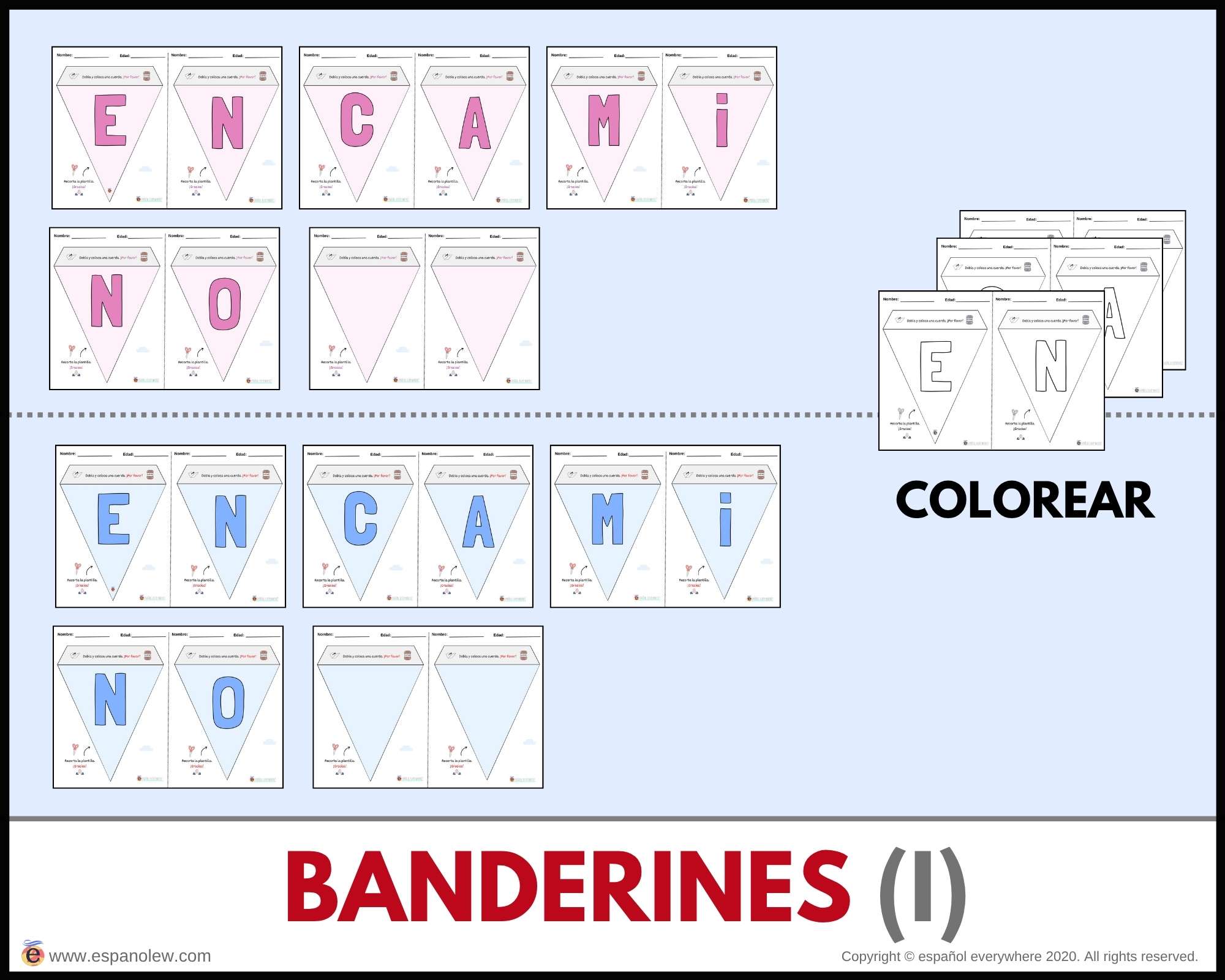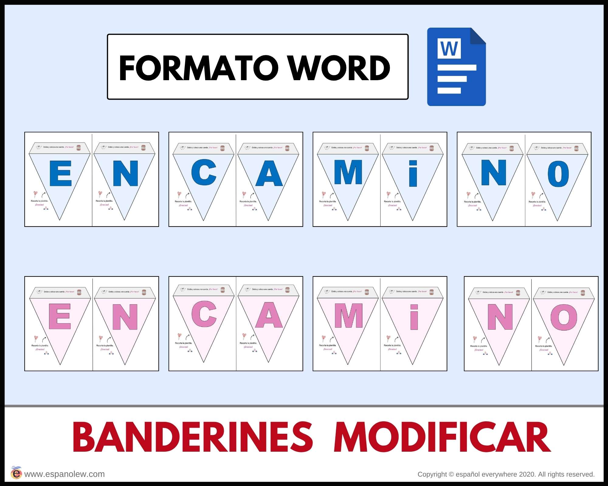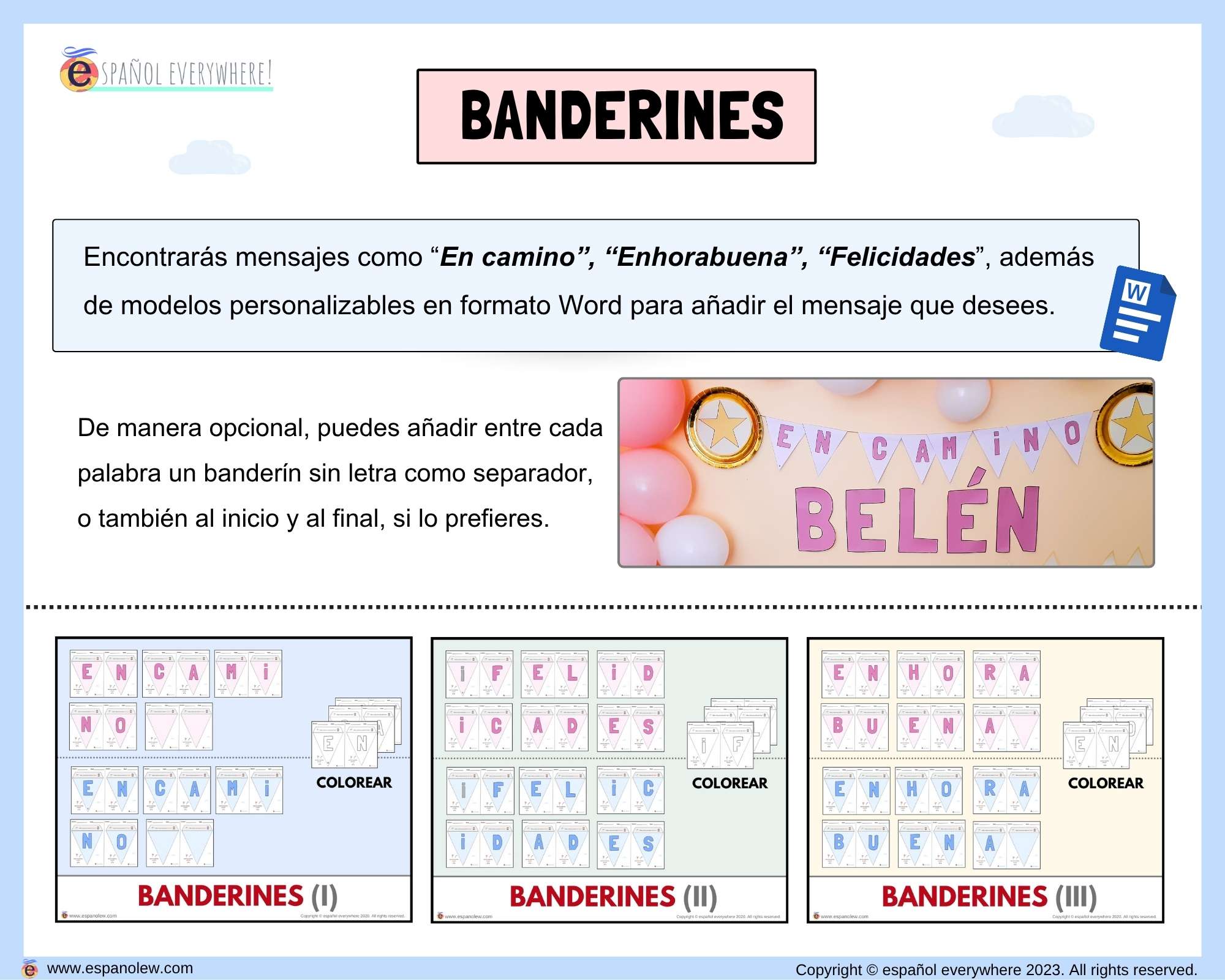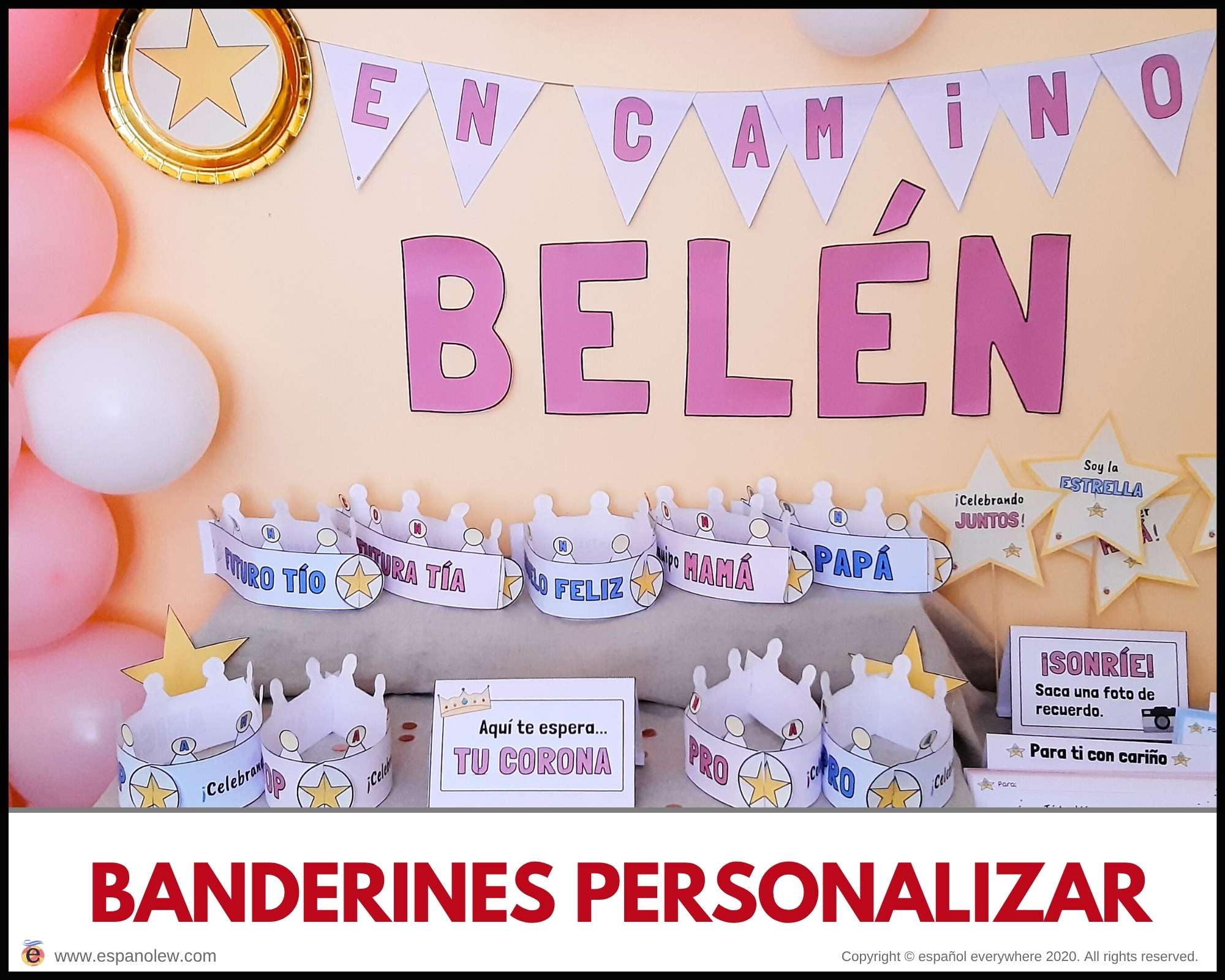 Coloca los banderines con mensajes personalizados para festejar. El pack incluye modelos con las letras ´En camino´, Enhorabuena´ y ´Felicidades´ aunque puedees adaptarlo fácilmente con las plantillas Word.