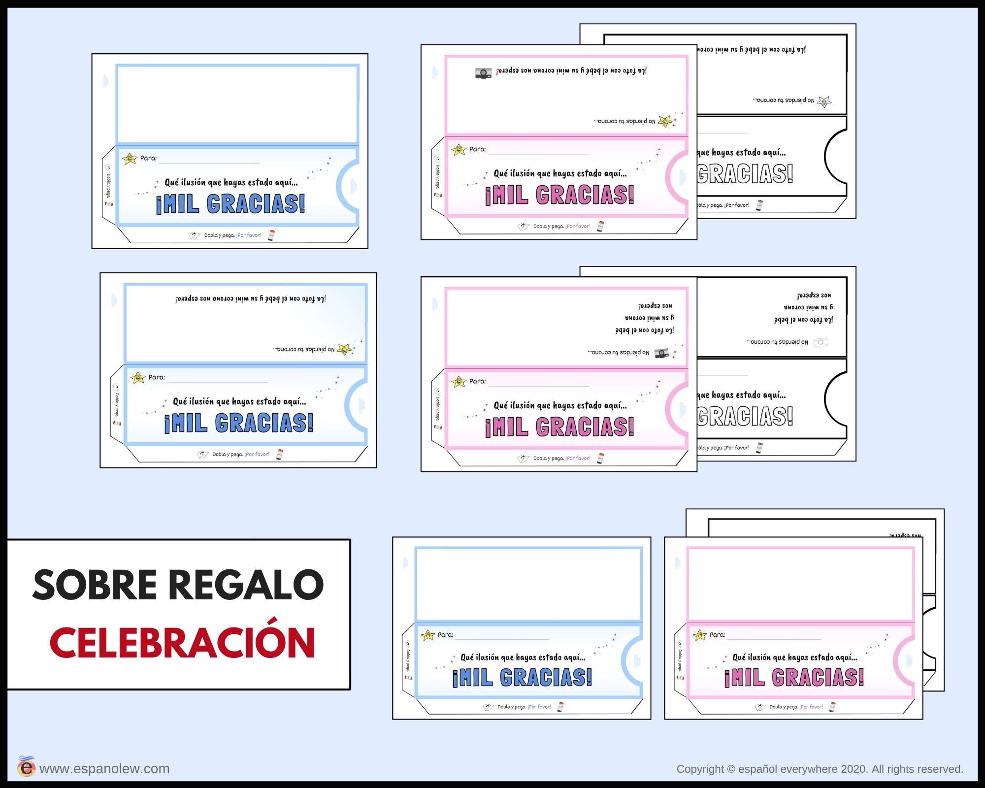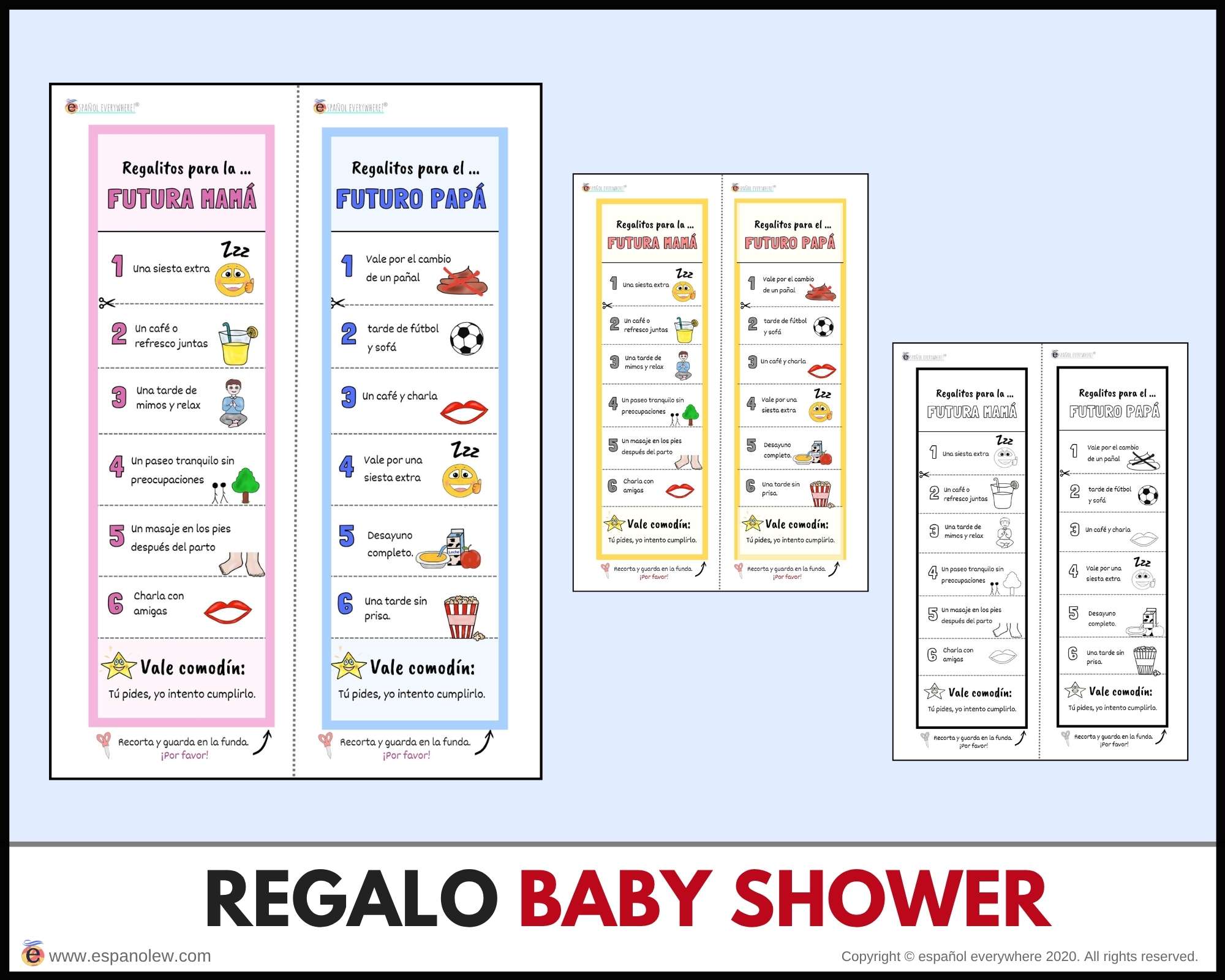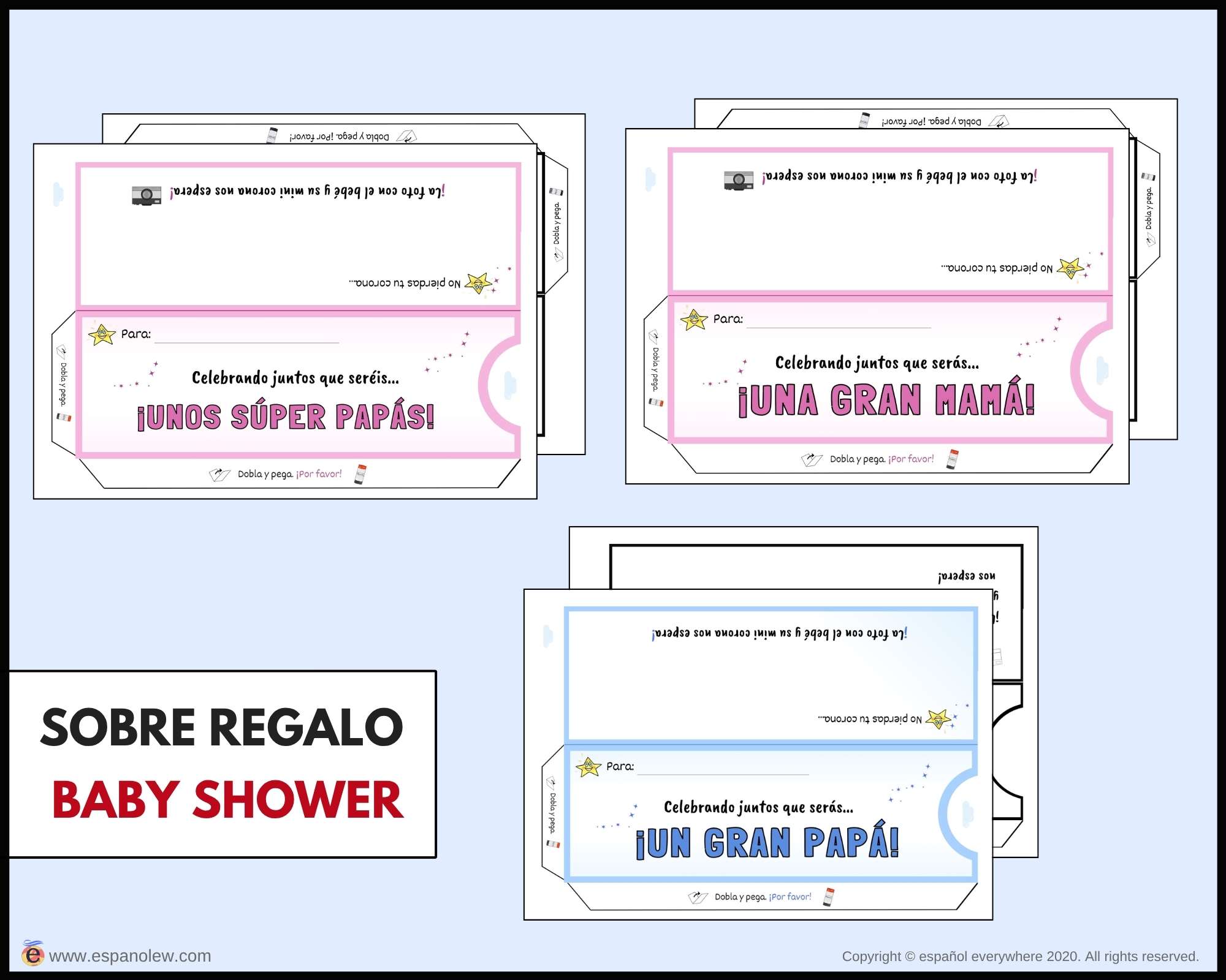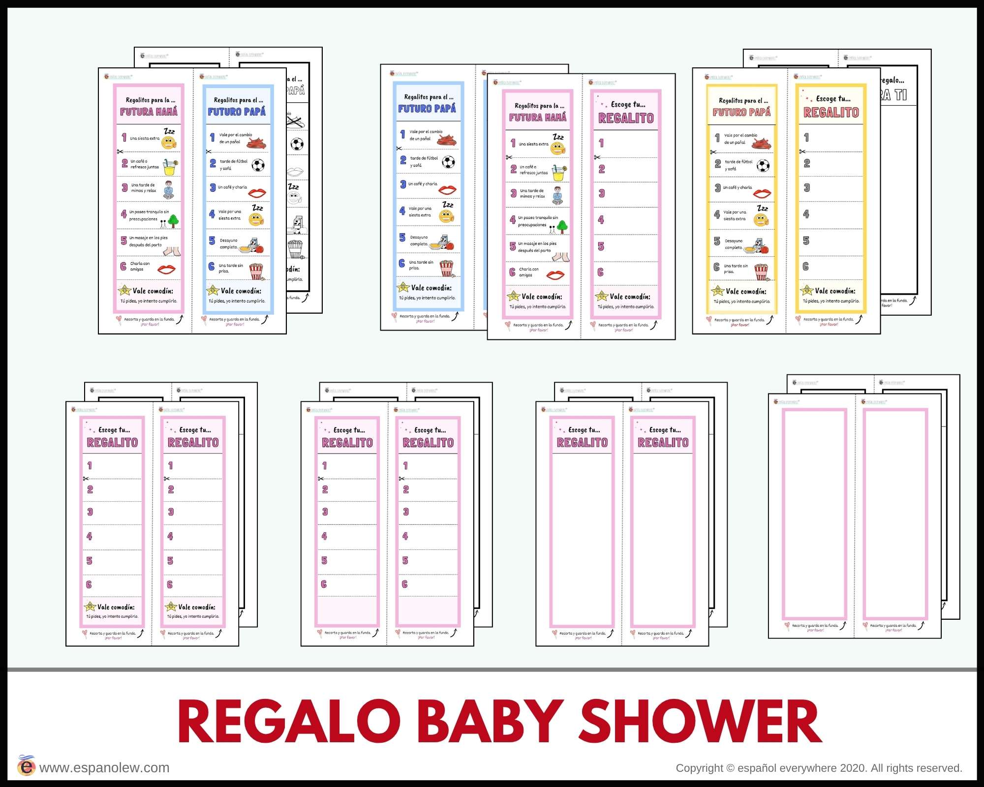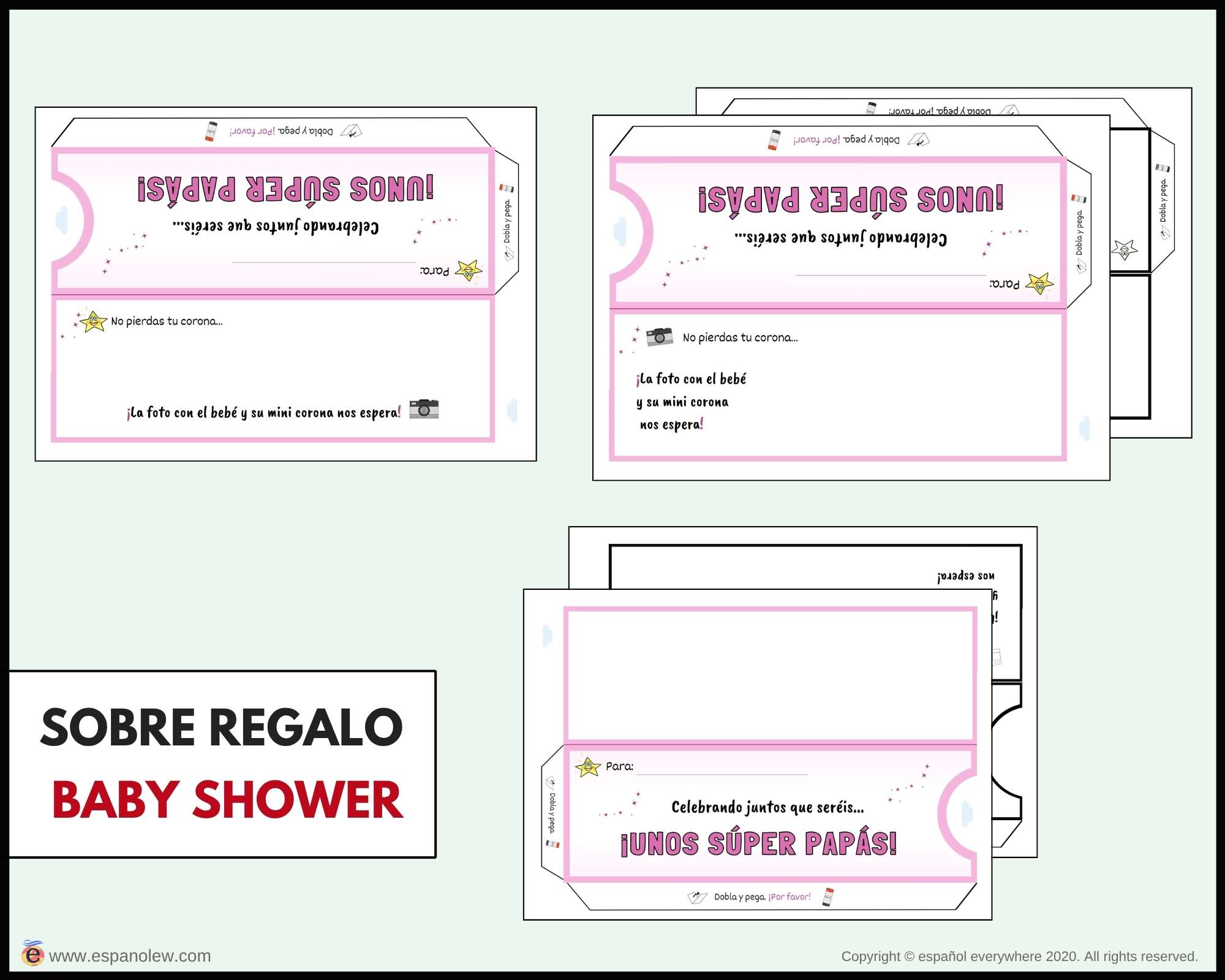 Consigue en el siguiente enlace los materiales para tu fiesta. Si pinchas en el producto encontrarás la opción de ´baby shower´y ´de fiesta´. La única diferencia entre ambas son los vales y sobres, que son específicos para cada uno.
