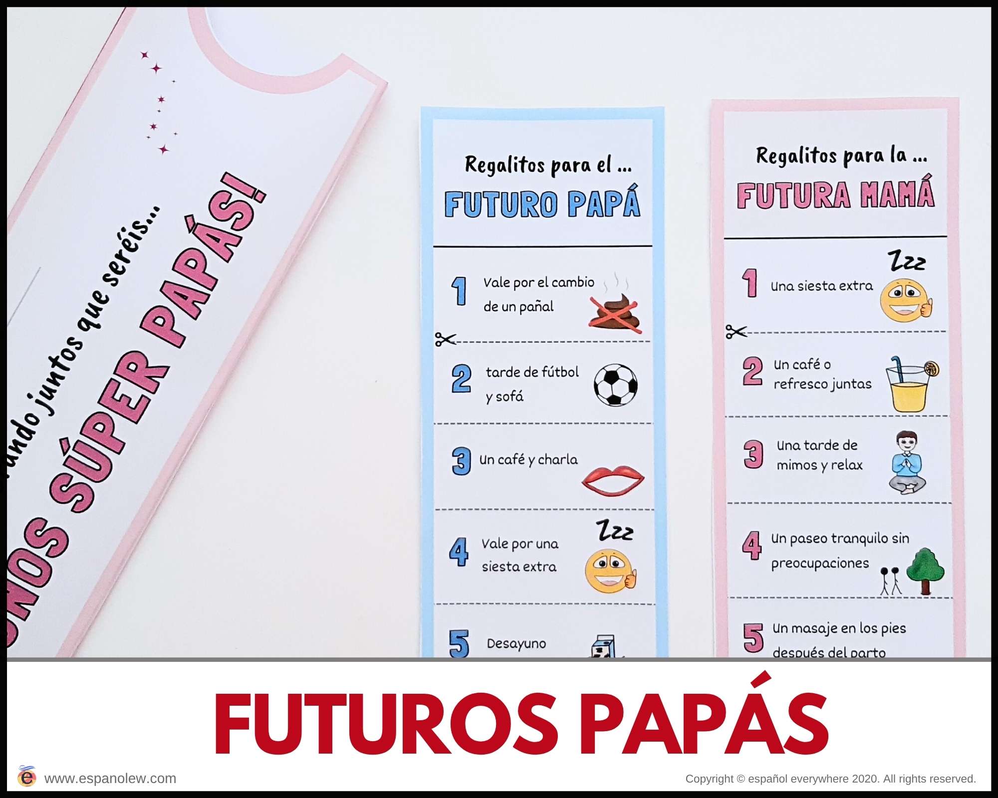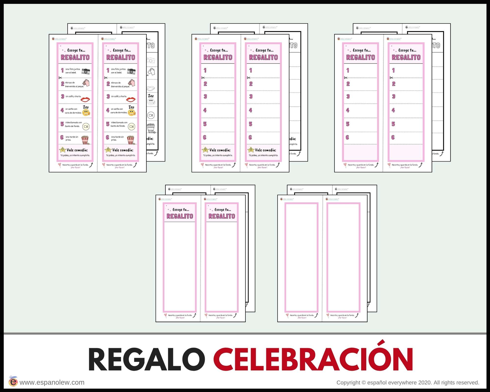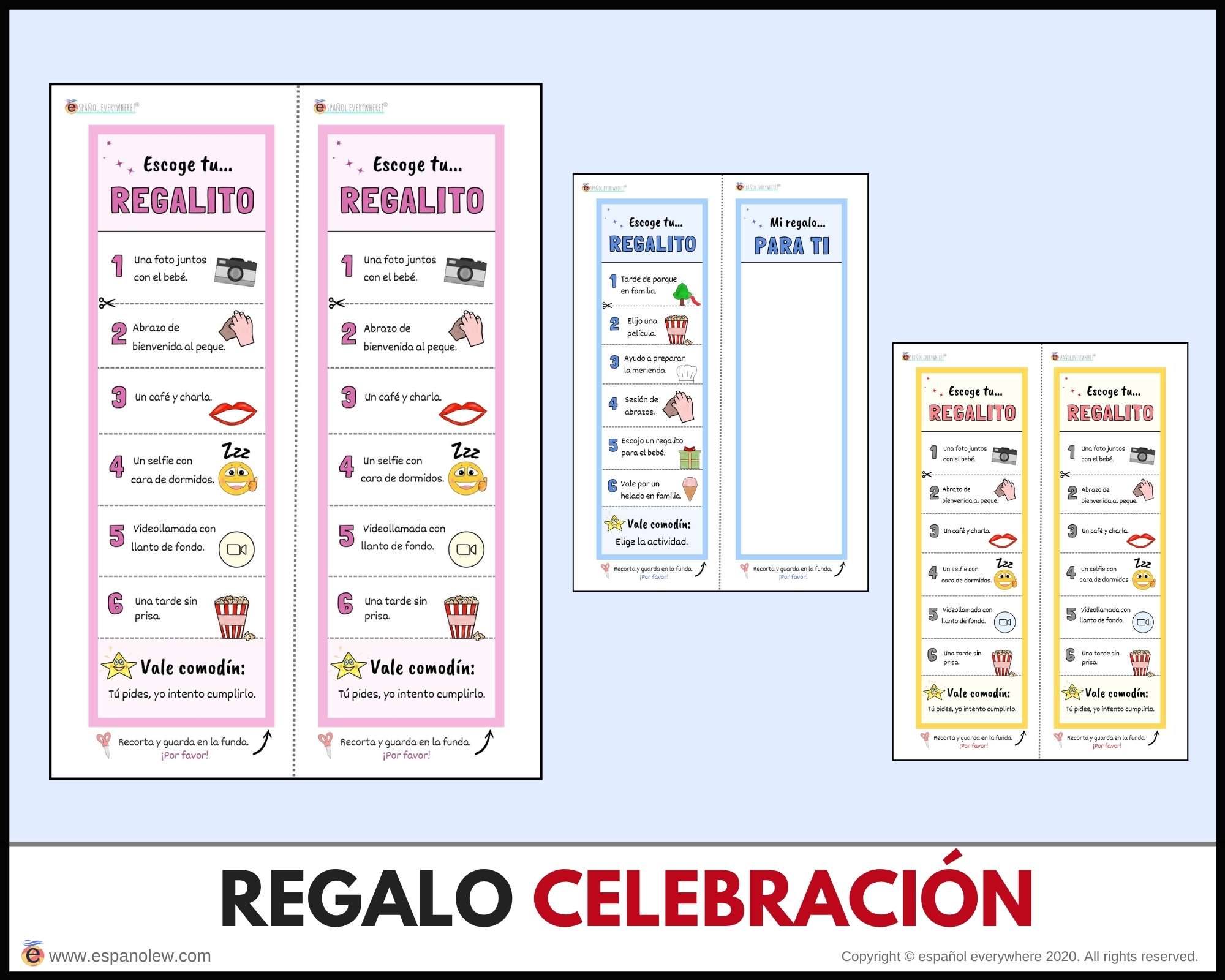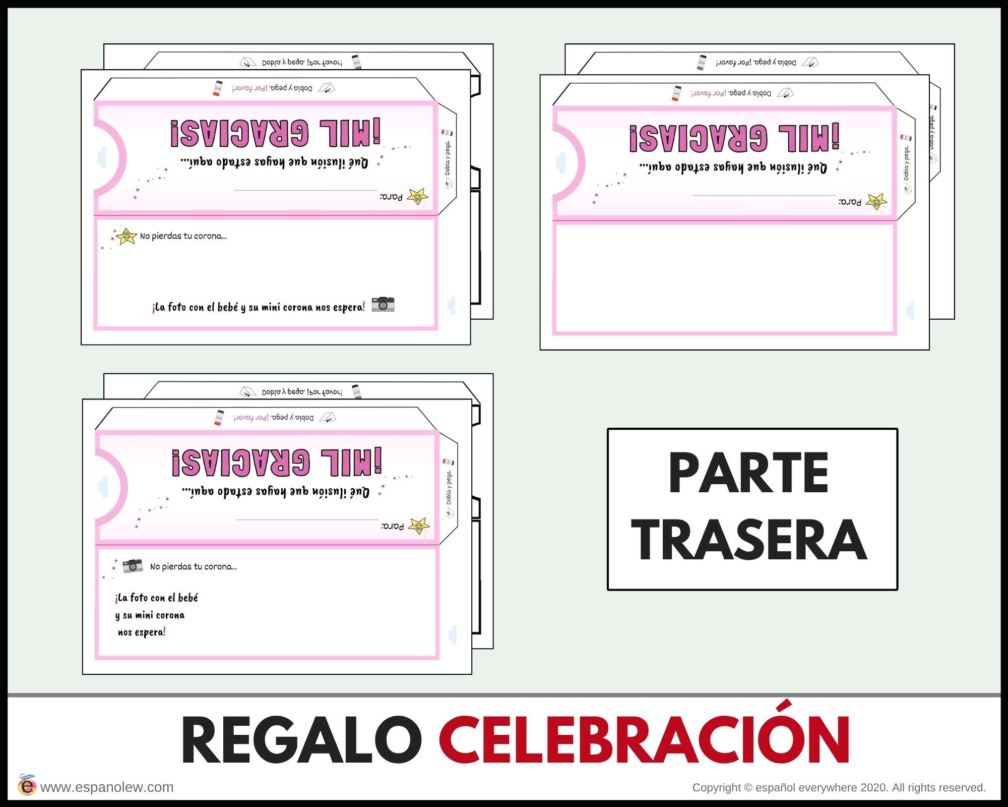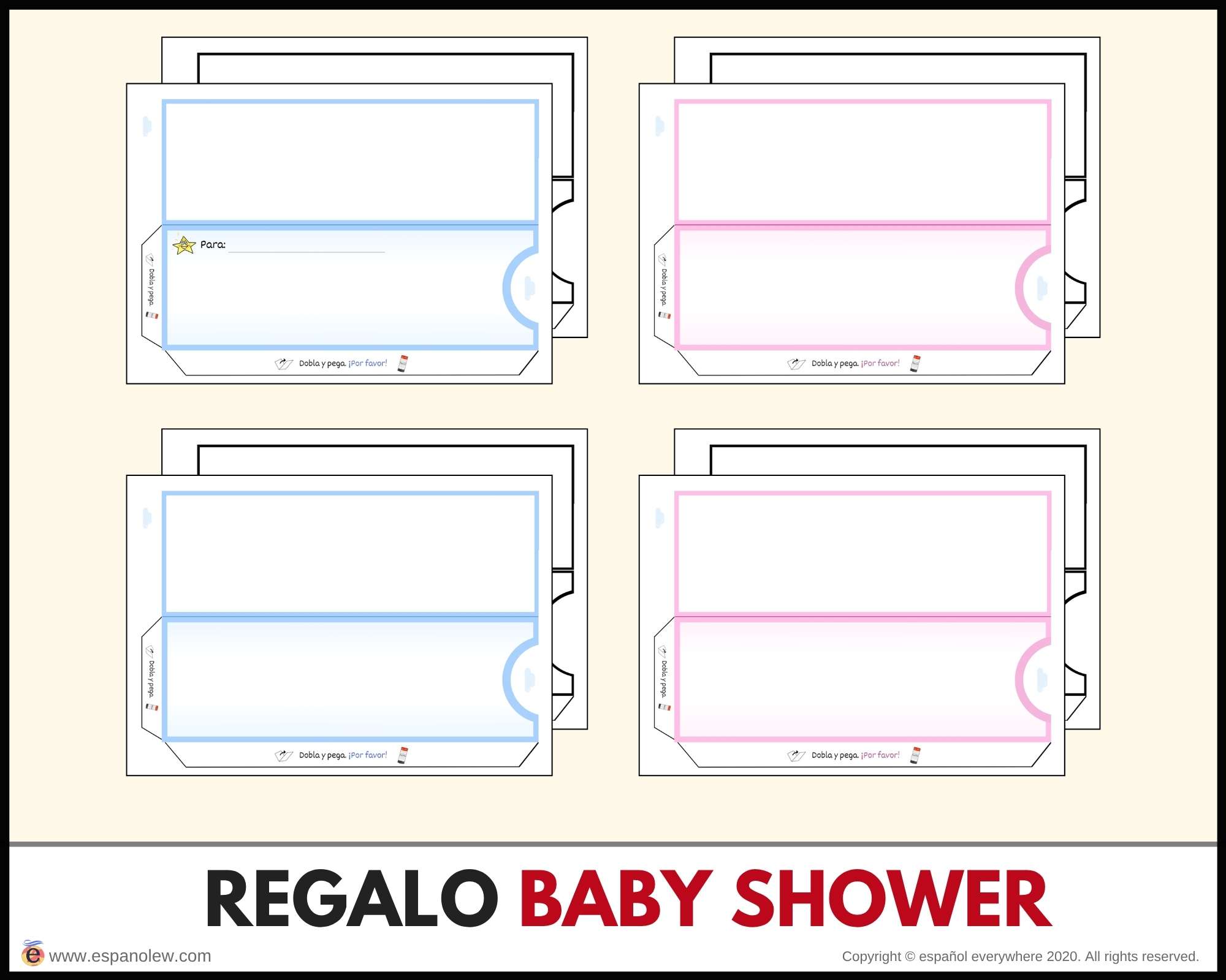 Consigue en el siguiente enlace los materiales para tu fiesta. Si pinchas en el producto encontrarás la opción de ´baby shower´y ´de fiesta´. La única diferencia entre ambas son los vales y sobres, que son específicos para cada uno.