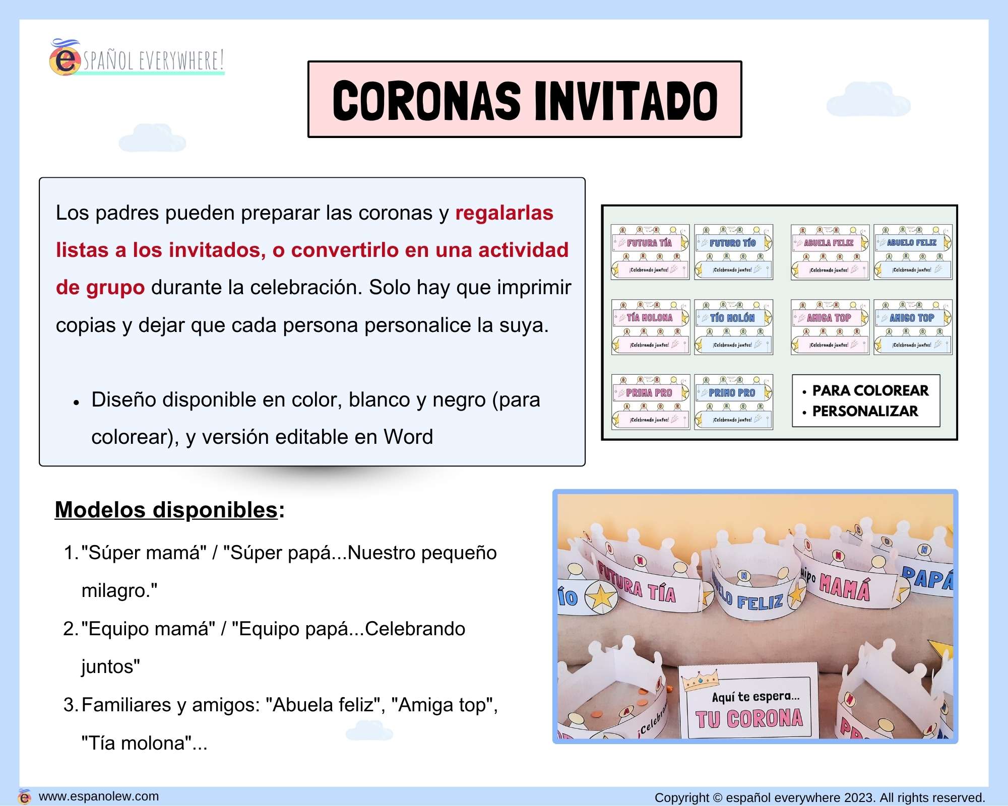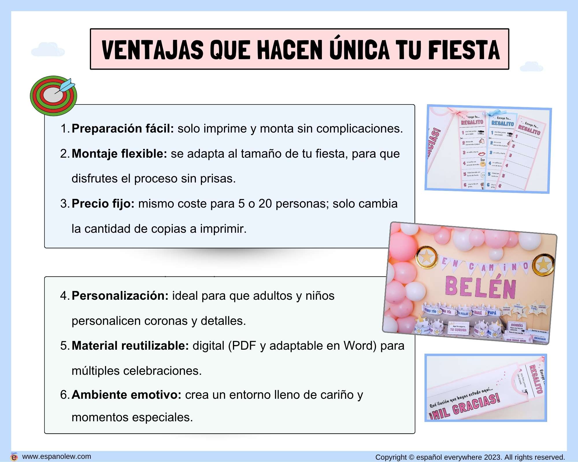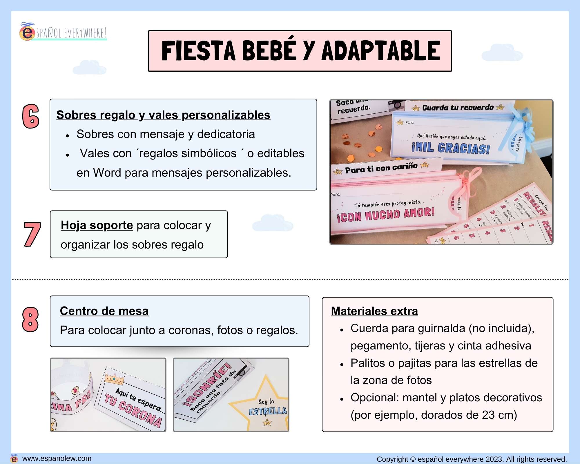 Este pack es fácil de preparar, con precio fijo sin importar el número de invitados. Perfecto para que adultos y niños personalicen detalles. Los materiales digitales son reutilizables y 100% personalizables para adaptar a tu estilo y cualquier celebración, creando un ambiente emotivo y lleno de cariño.